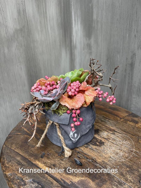 Mini taartje 15cm geprepareerde hortensia's, pepperberry, echeveria, bonzaihout