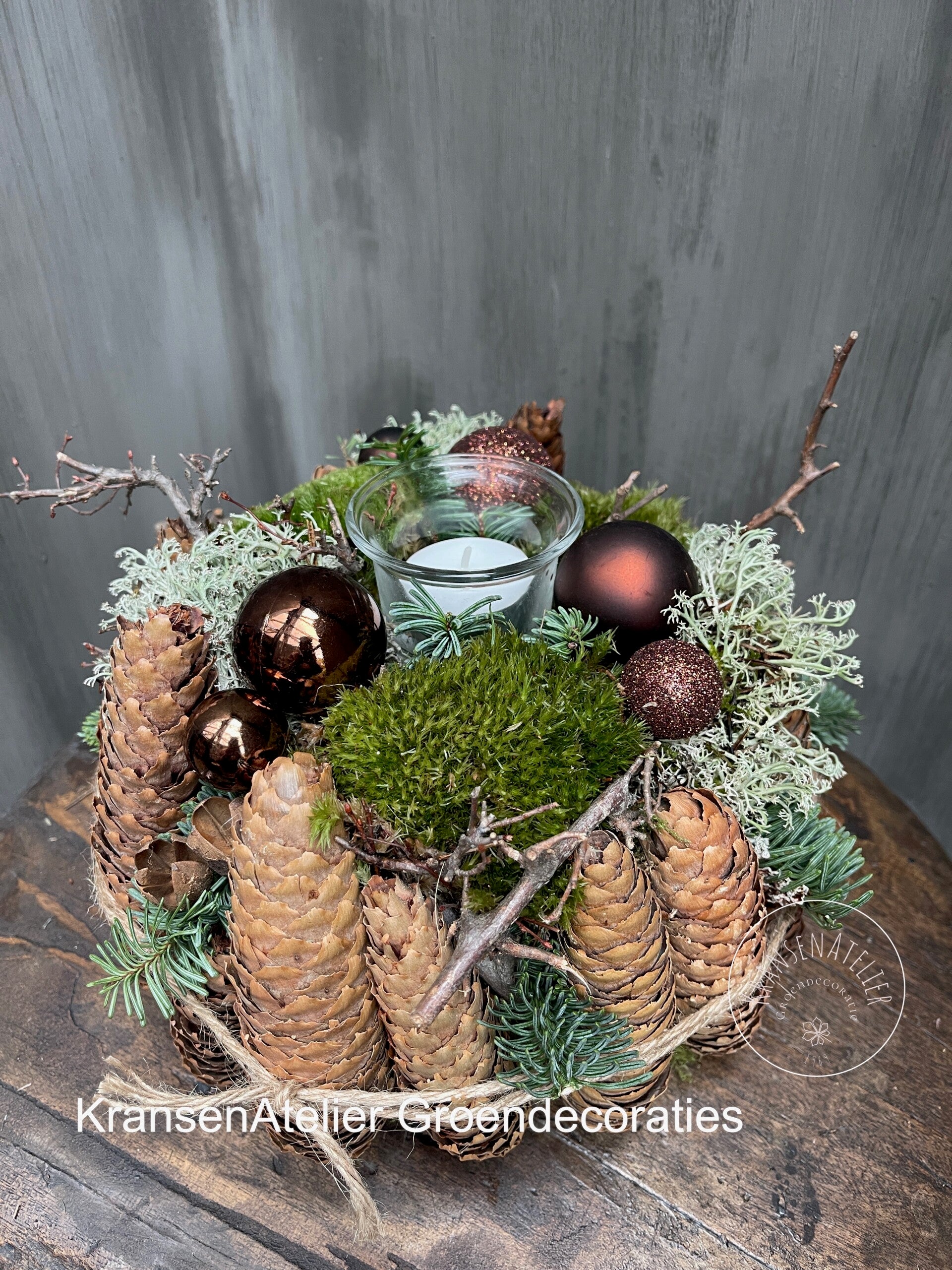 Kerst taartje 25 cm, sparrenapels, bolmos, zilvermos, glazen waxinelichtje en kerstballetjes.