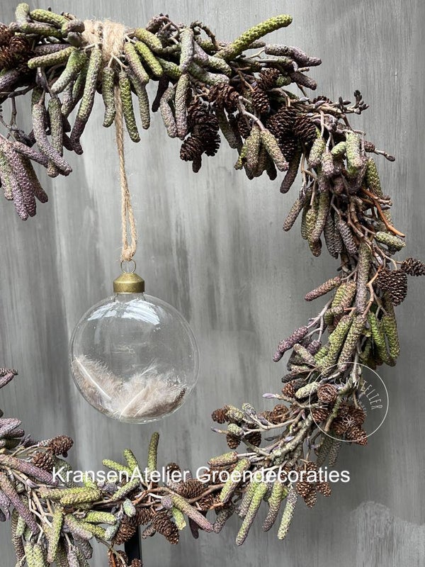Krans op voet, 50cm hoog, 40cm breed, Elsenproppen en glazen ei.