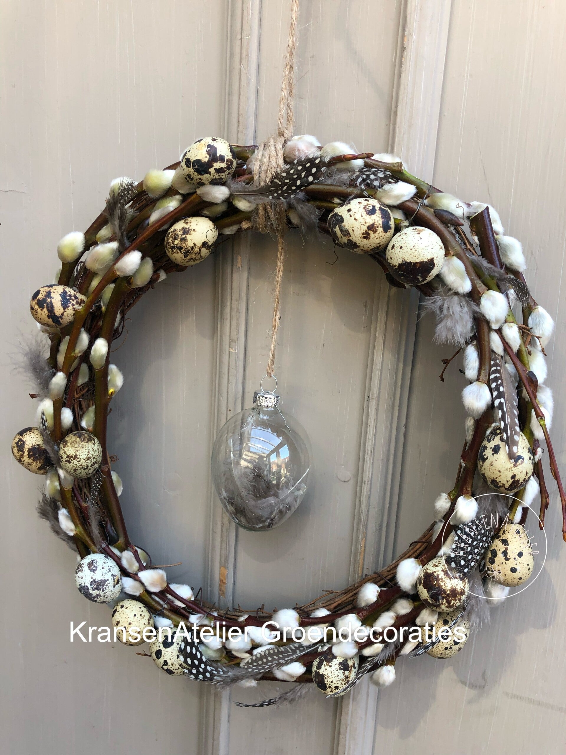 Paaskrans 30cm, smal, katjes ,eitjes, veertjes, glazen ei