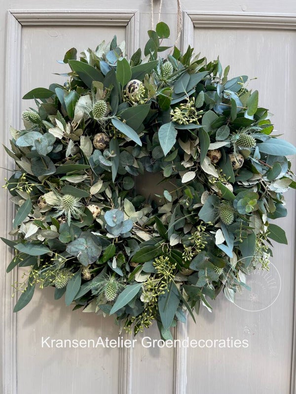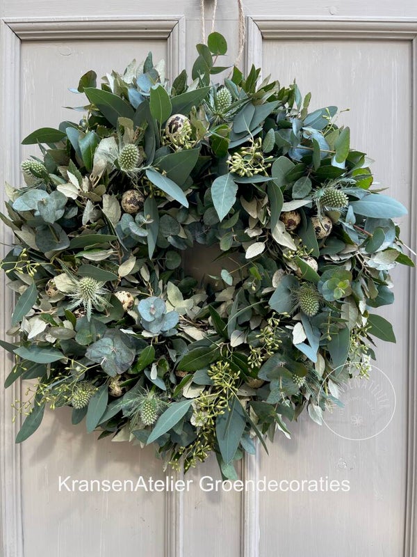 Krans paas 40cm, Steeneik, Eucalyptus, groene distels, eitjes.