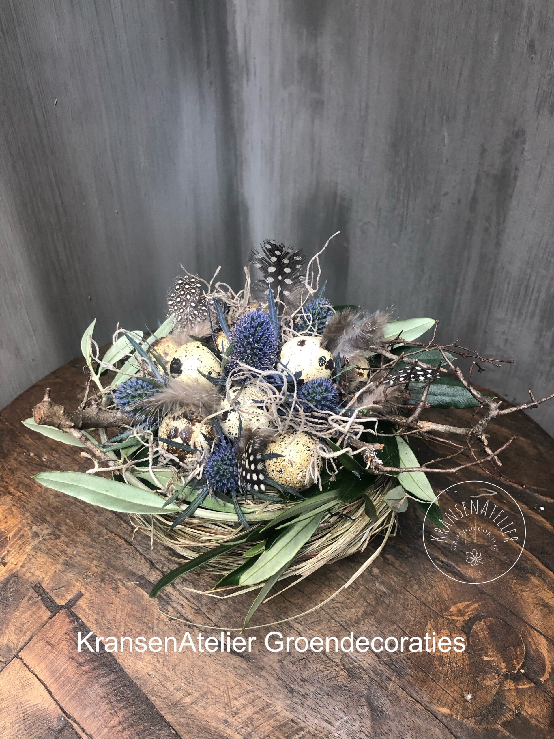 Paasnest mini 15cm, Blauwe distel, eitjes, veertjes en olijfblad.